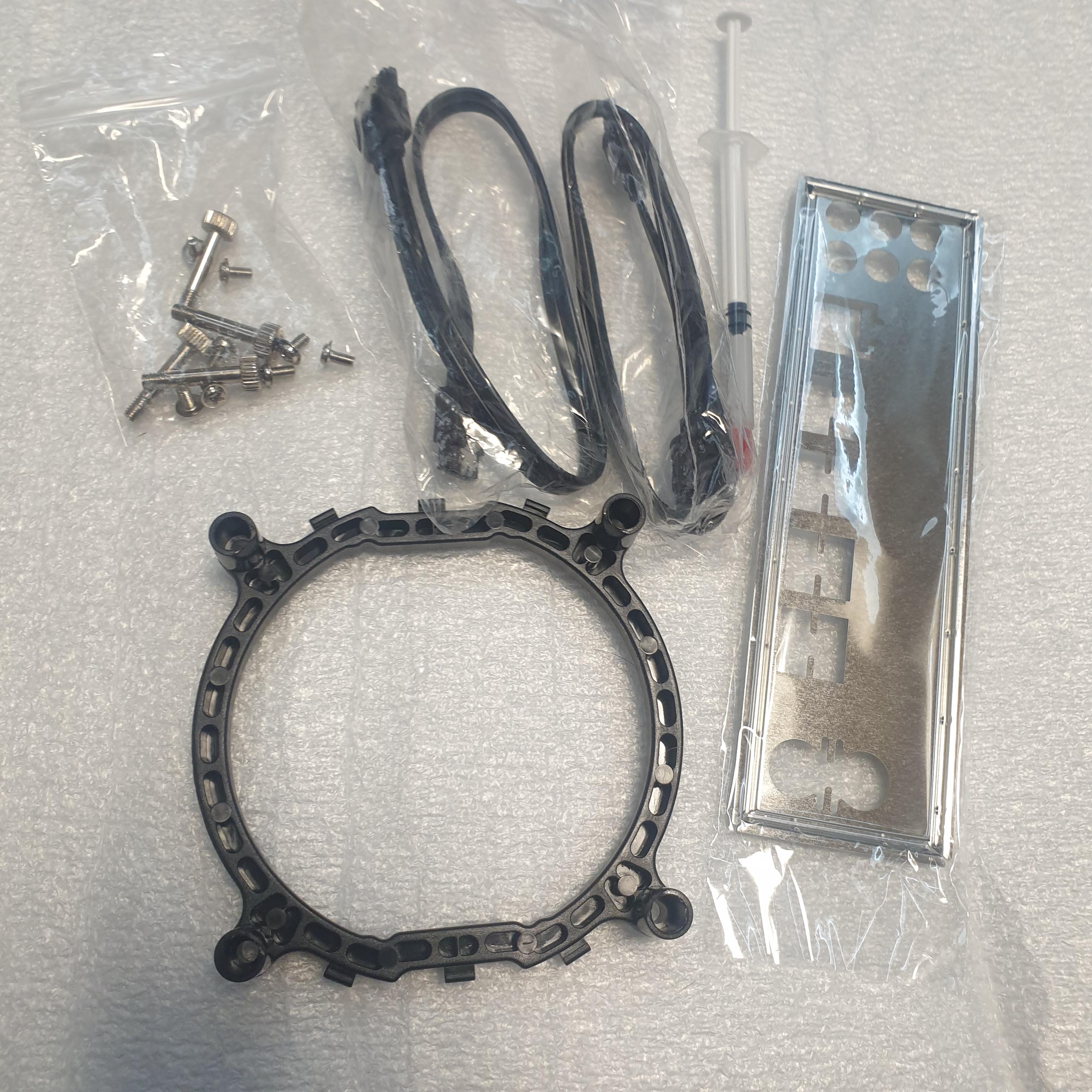 구성품으로 보증 종이와 설명서, 시피유 쿨러 가이드와 나사, SATA선 두개, I/O패널 그리고 적은 양의 써멀이 들어있네요. 보증 종이야 읽을 일이 없고 설명서도 중국어로 되어있어서 읽지 못했습니다.