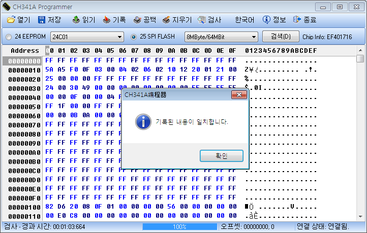 기록이 끝나면 제대로 기록이 됐는지 확인을 위해 검사를 눌러줍니다. 위와 같은 창이 뜨면 제대로 기록디 된겁니다.